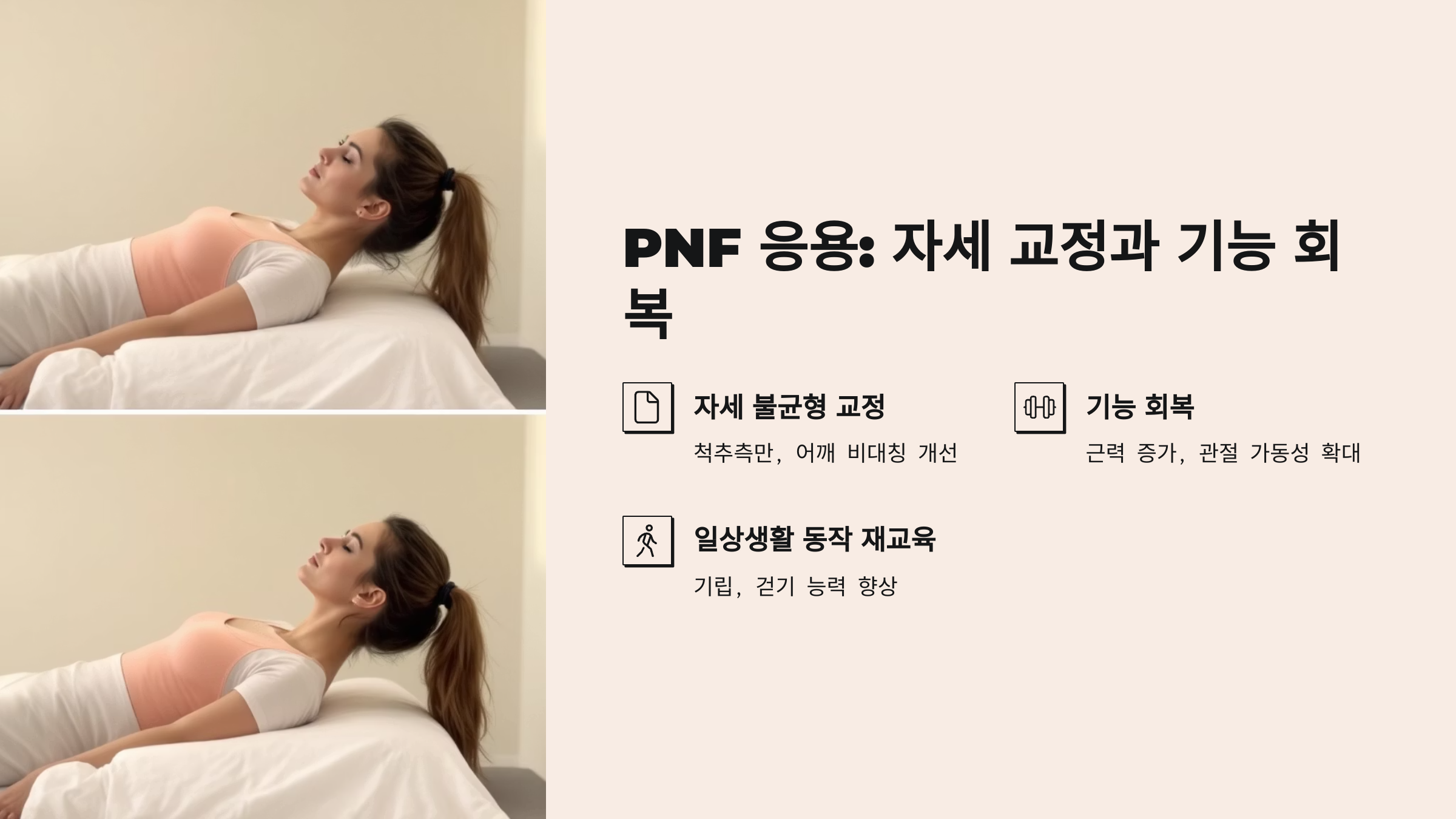 PNF는 단순한 관절 운동을 넘어서 자세 교정에도 많이 사용돼요. 골반 비대칭, 어깨 불균형, 측만증 환자에게 매우 유용하죠.