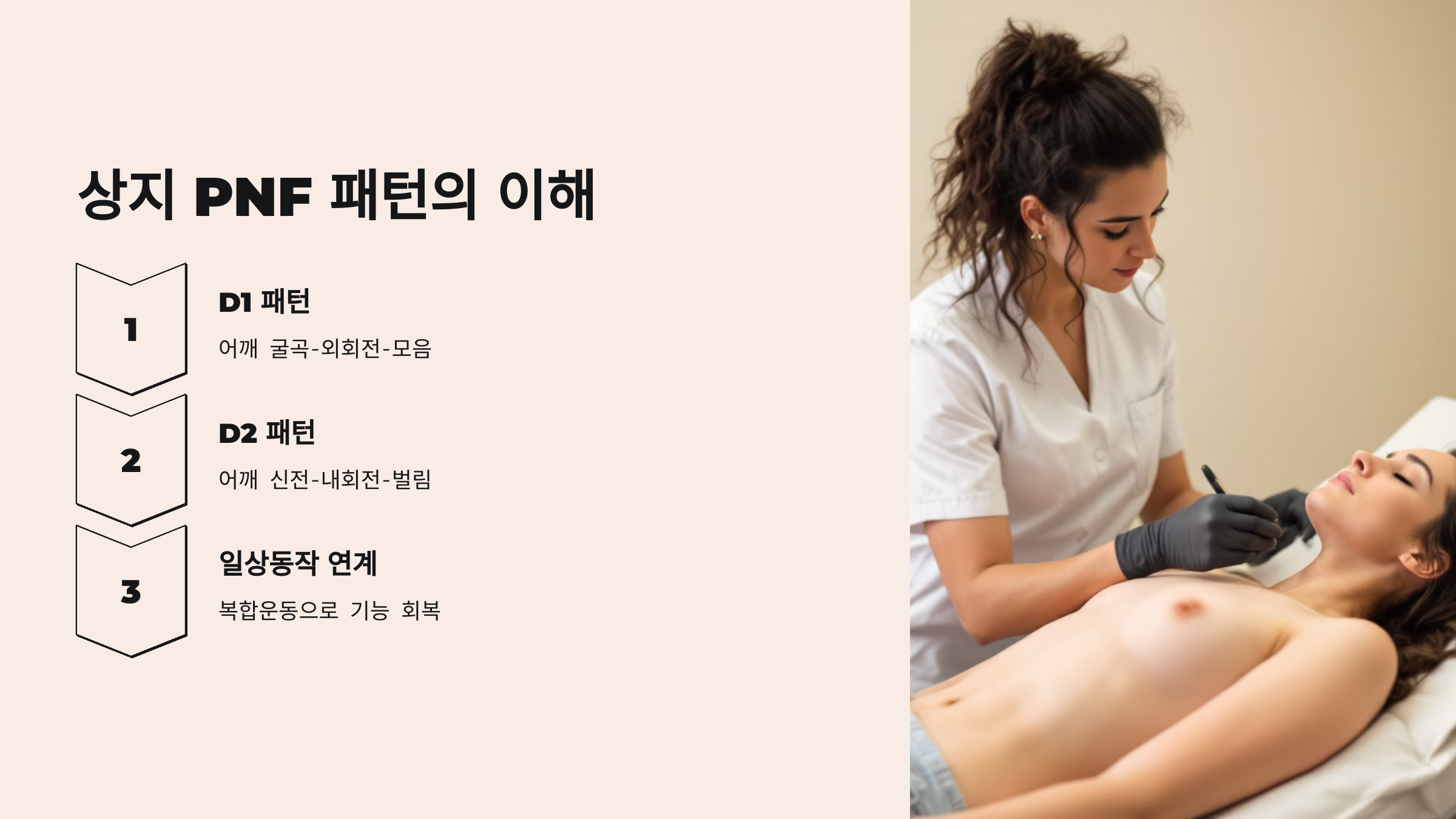 상지 PNF는 주로 어깨 관절 가동성과 팔의 기능적 움직임 회복에 초점을 맞춰요. D1과 D2라는 대표 패턴이 있고, 팔을 교차시키거나 회전시키는 움직임이 포함돼요.