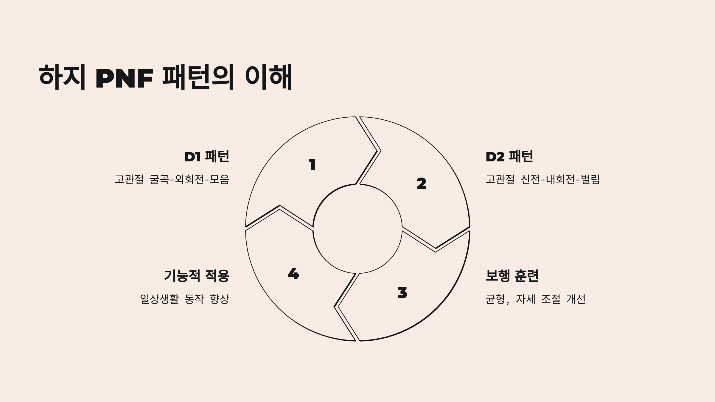 하지 PNF는 보행, 계단 오르기, 균형 유지 등을 목표로 설계돼요. 다리 역시 D1과 D2 패턴으로 나뉘며, 고관절-무릎-발목의 통합 움직임이 중요해요.