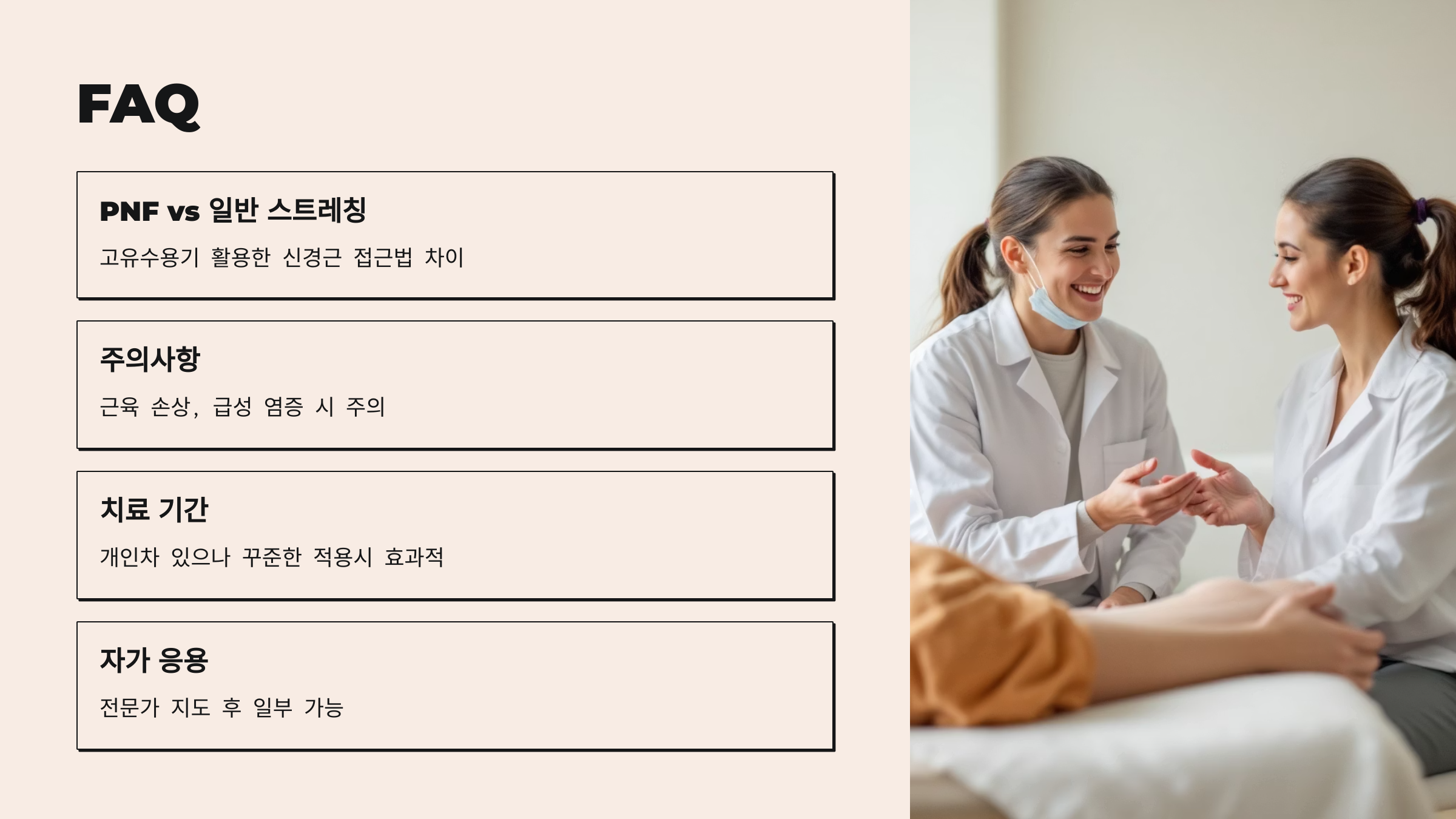 A1. 일반 스트레칭은 근육 길이를 늘리는 데 집중하지만, PNF는 신경과 근육의 협응을 회복하는 통합 훈련이에요. 신경자극을 동반한 움직임이 핵심이에요.